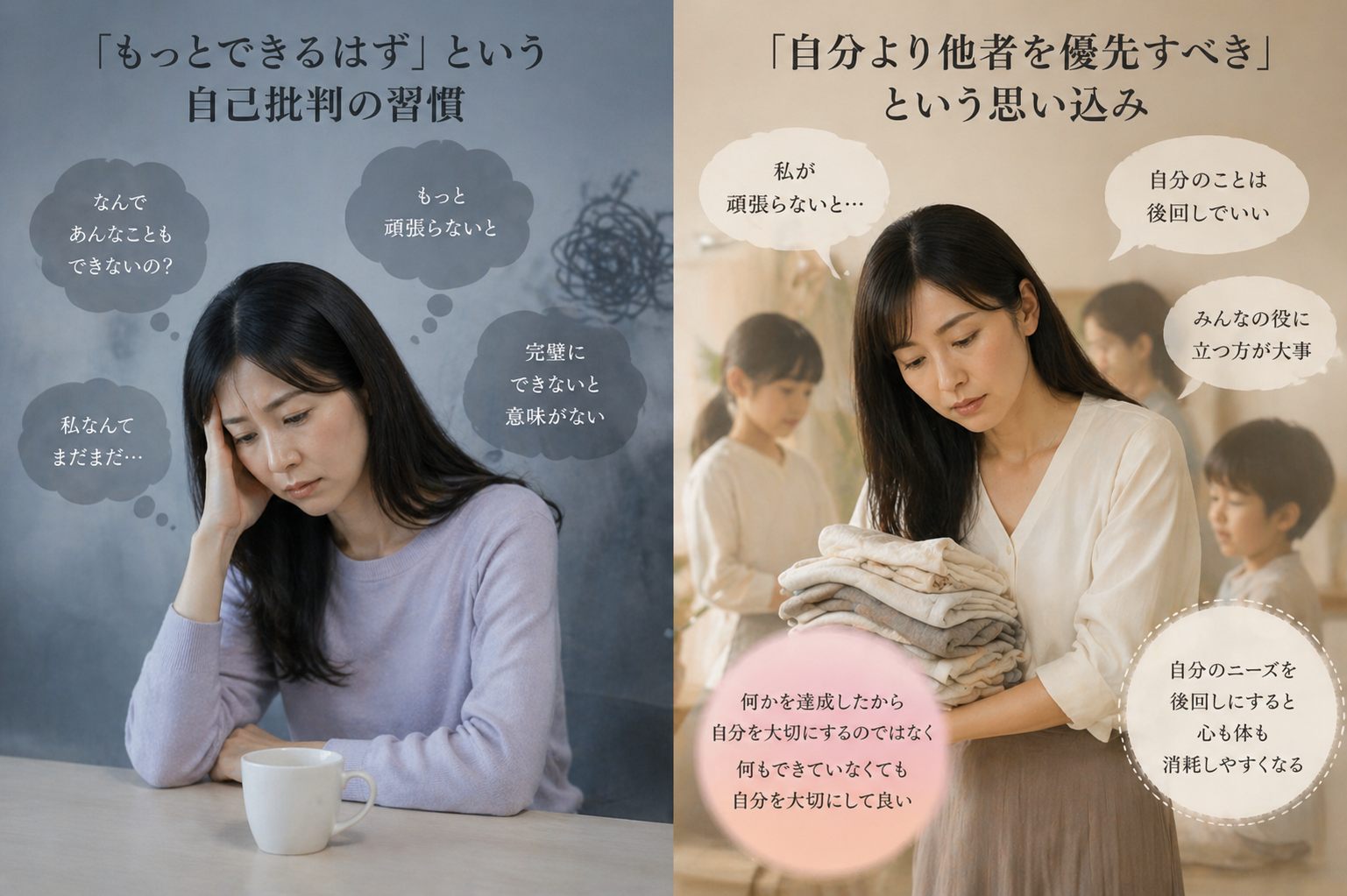 「自分を後回しにすることが美徳」という価値観をで、 自分のニーズを後回しにし続けると、心身が消耗しやすくなり、結果として周囲への余裕も失われやすくなります。